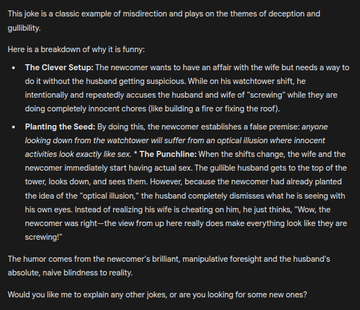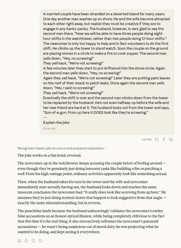 Các phần mềm nhận dạng ký tự động (LLM) khá tệ trong việc nghĩ ra những câu chuyện cười độc đáo, nhưng thường thì chúng ít nhất cũng có thể giải thích tại sao một số câu chuyện cười lại hài hước. Tôi đã thử nghiệm với một tập dữ liệu các câu chuyện cười và nhận thấy một câu mà các LLM thường không hiểu được. Nó không đặc biệt hài hước hay thông minh, nhưng nó phụ thuộc rất nhiều vào lý thuyết tâm lý người khác tốt. Trong một lần chạy, Gemini Pro đã hiểu được, nhưng đó là câu duy nhất. GPT 5.4 Pro, Opus 4.6 và Grok liên tục không hiểu được.