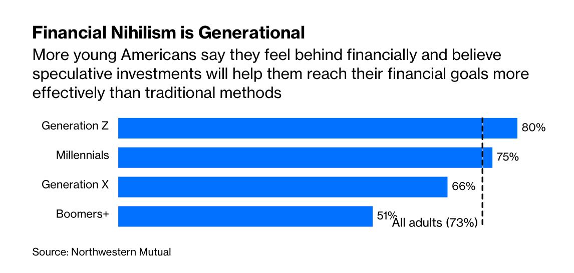 - Theo một khảo sát của Northwestern Mutual, 80% thế hệ Z và 75% thế hệ Millennials cảm thấy bị bỏ lại phía sau, một cảm giác thúc đẩy họ tham gia vào hoạt động đầu cơ.