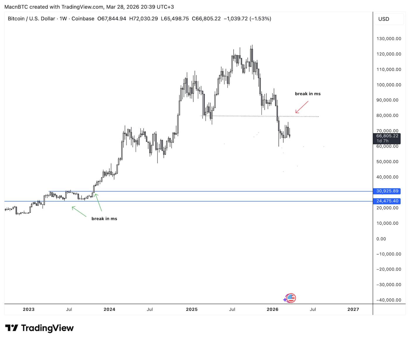 Bây giờ hãy nhìn sang phía bên phải. Giá Bitcoin đạt đỉnh khoảng 125.000 đô la, sau đó bắt đầu hình thành các đỉnh thấp hơn. Sau đó, giá giảm xuống dưới "đáy cao hơn" (mũi tên đỏ trên biểu đồ) ở mức khoảng 85.000 đến 90.000 đô la, và cấu trúc này vừa bị phá vỡ xuống dưới. Giá hiện tại vào khoảng 66.000 đô la.