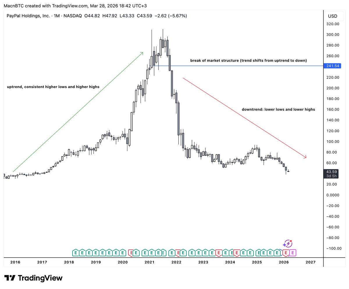Biểu đồ hàng tháng của PYPL là một ví dụ tuyệt vời về cấu trúc thị trường. Ở bên trái, có thể thấy rõ xu hướng tăng. Biểu đồ nến cho thấy các đáy cao hơn và đỉnh cao hơn, với giá tiếp tục tăng.
