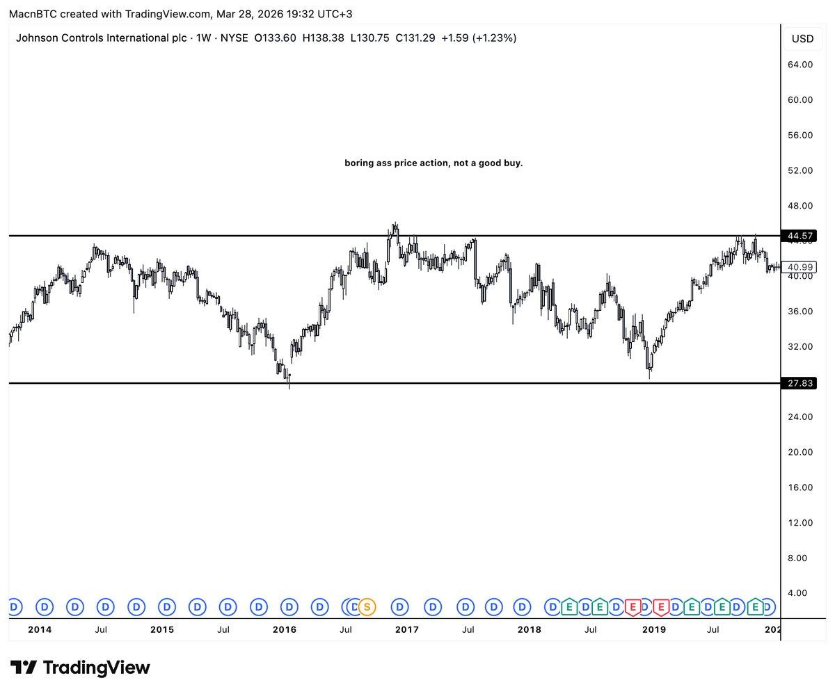Đây là biểu đồ cho thấy thị trường đã trì trệ trong hơn năm năm. Nó vẫn là sự tích lũy đi ngang nhàm chán, không có sự đột phá nào trong cấu trúc thị trường, chỉ là chuyển động ngang đều đều. Đừng bao giờ mua cổ phiếu khi biểu đồ như thế này; bạn thà lấy tiền của mình và đặt cược vào một con ngựa ô ở Las Vegas còn hơn.