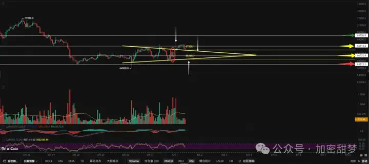 2) Mức 65000 là đáy ngắn hạn (việc giảm xuống dưới mức này cho thấy xu hướng giảm). Mua vào dưới 67450 có khả năng sinh lời. Không nên mở thêm vị thế mua (long) trên 68000 cho đến khi có sự phá vỡ đáng kể trên 72000.