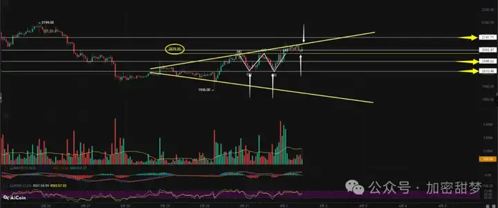 (1) Hiện tại, ETH đang hình thành đỉnh chữ M với các điểm cao và thấp di chuyển xuống trên biểu đồ bốn giờ. Chiến lược chính là short khống trên 2141 và không đuổi theo giá lên.