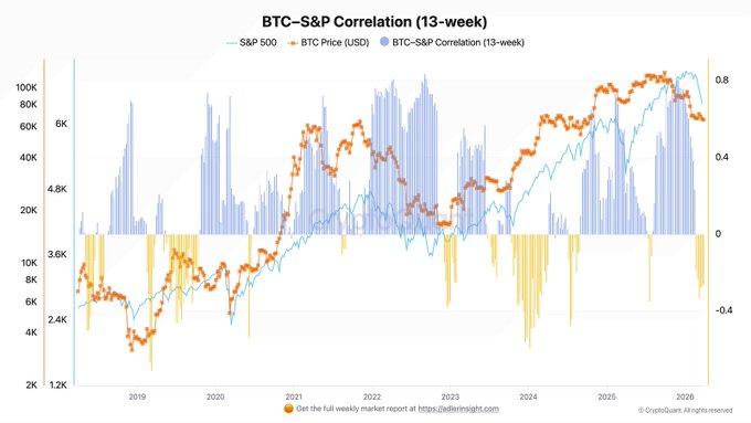 Nhà nghiên cứu Bitcoin Axel Adler Jr. chỉ ra rằng mối tương quan ngắn hạn giữa Bitcoin và chỉ số S&P 500 đã suy yếu, với mối tương quan trong 13 tuần rơi vào vùng âm.