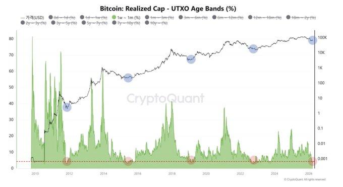 Dữ liệu Chuỗi cũng cho thấy thị trường đang ổn định. Nhà phân tích crypto MAC_D chỉ ra rằng chiếm tỷ lệ người nắm giữ ngắn hạn (đặc biệt là những người nắm giữ trong một tuần đến một tháng) đã giảm xuống còn 3,98%. Trong các chu kỳ thị trường trước đây, những giai đoạn mà tỷ lệ này dưới 4% thường tương ứng với những giai đoạn thị trường gần chạm đáy.