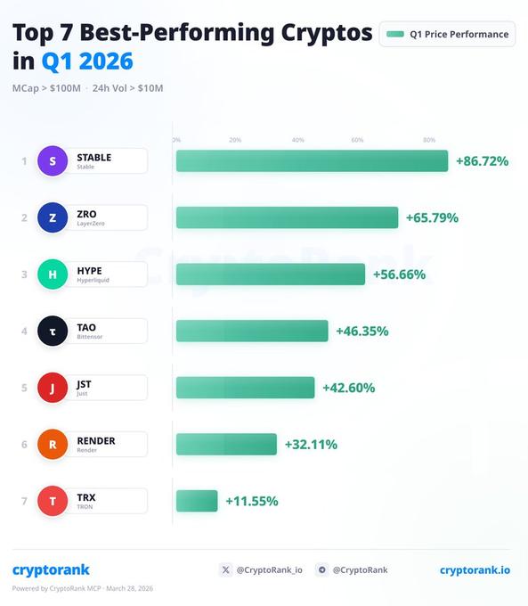 Quý 1/2026 ghi nhận nhiều biến động trên thị trường crypto, với một số altcoin đạt mức tăng từ 30% đến gần 90%. Theo dữ liệu từ CryptoRank, các dự án có hiệu suất tốt nhất gồm: STABLE (+86.72%), ZRO (+65.79%), HYPE (+56.66%), TAO (+46.35%), JST (+42.60%), RENDER (+32.11%) và TRX (+11.55%).