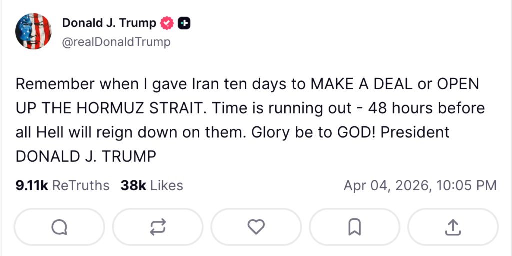 ToggleTổng thống Mỹ Trump lại có thêm một động thái nữa trên Truth Social tối qua (ngày 4): "Hãy nhớ khi tôi cho Iran mười ngày để xem liệu họ có thể đạt được thỏa thuận hoặc mở cửa eo biển Hormuz hay không? Giờ thì thời gian sắp hết rồi. Trong 48 giờ nữa, địa ngục sẽ giáng xuống họ. Vinh quang thuộc về Chúa."