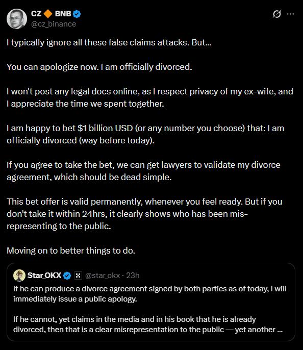 CZ sẵn sàng đặt cược 1 tỷ USD (hoặc bất kỳ con số nào Star Xu chọn) để khẳng định rằng ông đã thực sự ly hôn hợp pháp trước ngày hôm nay.