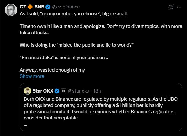 CZ cáo buộc Star Xu đang cố tình lái chủ đề sang chuyện cổ phần sàn Binance (vốn là bí mật kinh doanh) để né tránh việc phải thừa nhận mình đã tung tin sai sự thật về đời tư của CZ. Ông chốt lại bằng một thái độ khá bề trên khi yêu cầu Star Xu hãy "hành xử như một người đàn ông", xin lỗi và tuyên bố sẽ quay lại chế độ "lờ đi" (ignore mode) vì không muốn lãng phí thêm thời gian cho những tranh cãi này.