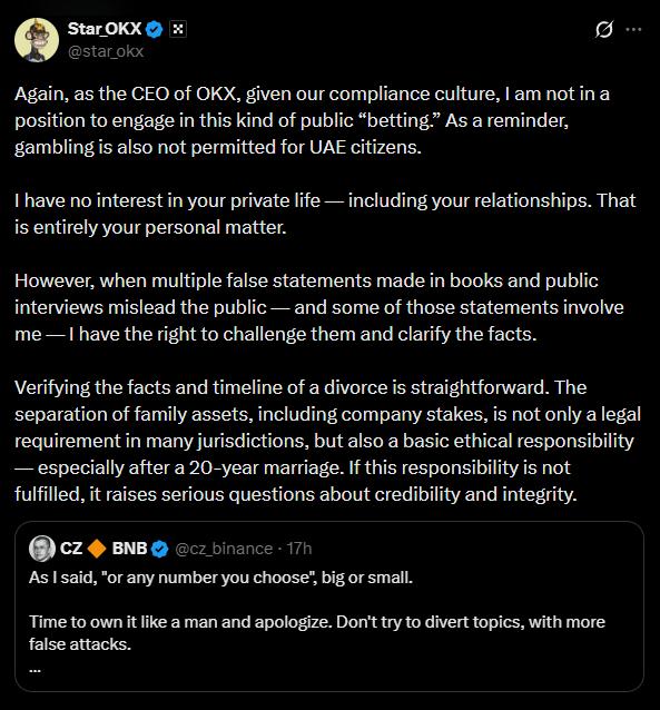 Thậm chí, Star Xu còn "nhắc nhở" CZ rằng cờ bạc là bất hợp pháp đối với công dân UAE (nơi CZ đang sinh sống). Thay vì nói về tình trạng hôn nhân, Star Xu xoáy sâu vào khía cạnh tài chính: Liệu CZ đã thực hiện phân chia cổ phần tại Binance với vợ cũ một cách minh bạch như Bill Gates hay Jeff Bezos hay chưa? Với Star Xu, đây không phải chuyện đời tư mà là vấn đề đạo đức kinh doanh và sự trung thực với công chúng.