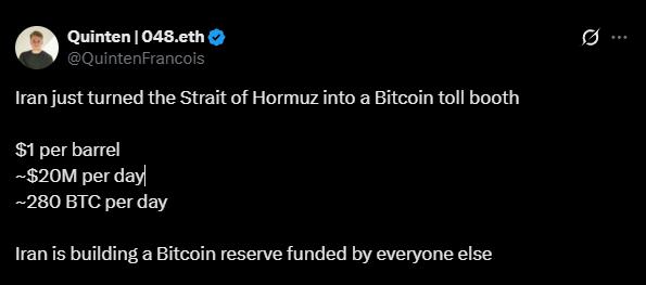 Iran đang yêu cầu các tàu chở dầu đi qua eo biển Hormuz thanh toán bằng tiền điện tử. Ông Hamid Hosseini, người phát ngôn của Liên minh các nhà xuất khẩu dầu mỏ, khí đốt và sản phẩm hóa dầu của Iran, gần đây đã đề cập cụ thể đến Bitcoin (BTC) trong một tuyên bố.