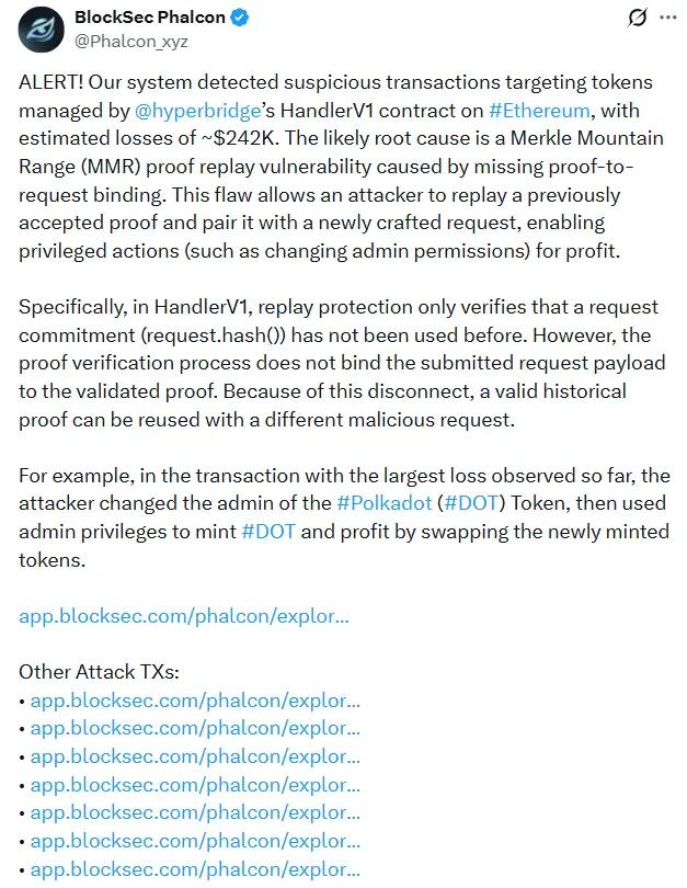 Sau đó, BlockSec Phalcon đã đưa ra cảnh báo kỹ thuật, phân loại lỗ hổng lần là lỗ hổng phát lại bằng chứng MMR. Theo phân tích của họ, nguyên nhân gốc rễ của lỗ hổng nằm ở chỗ cơ chế bảo vệ phát lại của hợp đồng HandlerV1 chỉ xác minh xem giá trị băm của yêu cầu đã được sử dụng hay chưa, nhưng quy trình xác minh bằng chứng không liên kết tải trọng yêu cầu đã gửi với bằng chứng đang được xác minh.