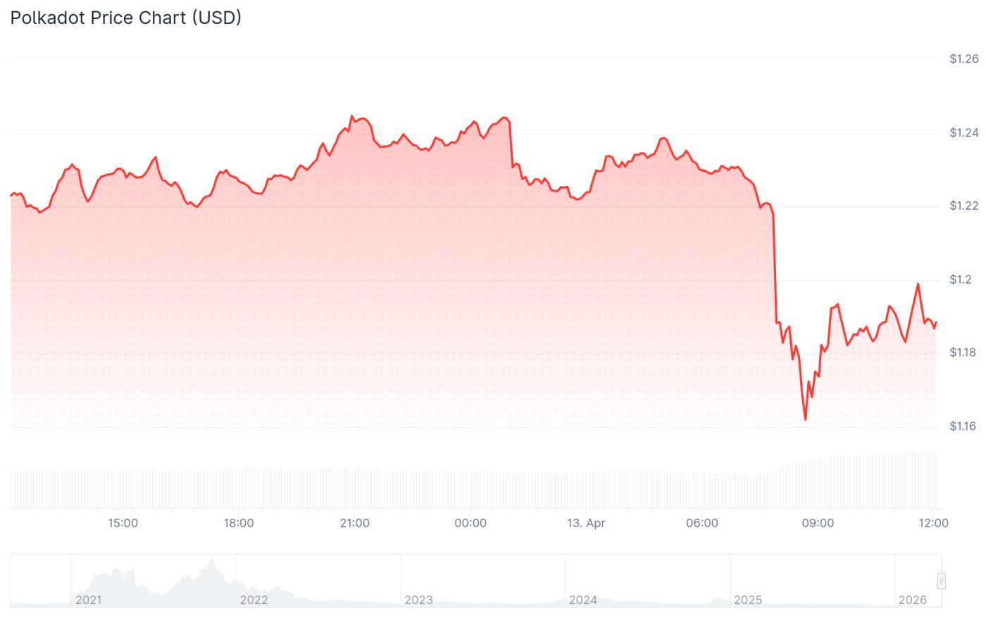 Token DOT native đã giảm nhẹ xuống mức thấp trong ngày là 1.16 USD vào thứ Hai, trước khi phục hồi lên trên 1.19 USD tại thời điểm viết bài, theo CoinGecko.