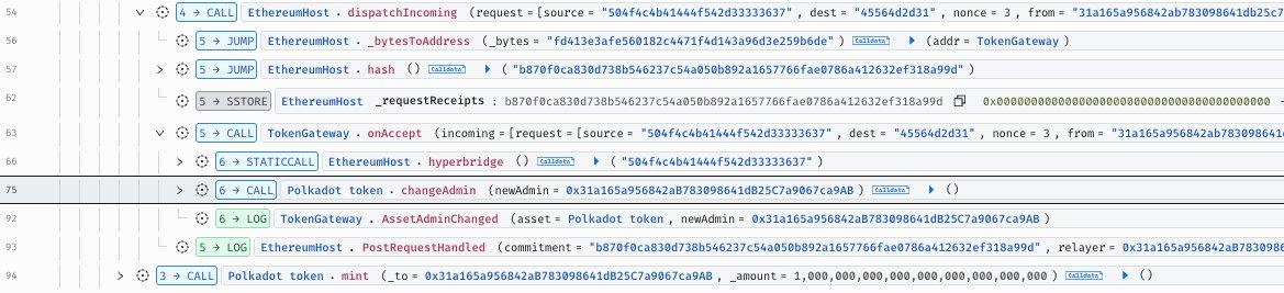 CertiK cho biết hacker đã mint được số token này sau khi “chèn một thông điệp giả mạo nhằm thay đổi quyền admin của hợp đồng token Polkadot trên Ethereum.” Thanh khoản hạn chế trong pool DOT bridge khiến số tiền hacker thu được bị giới hạn ở mức 108.2 ETH, tương đương khoảng 237.000 USD.