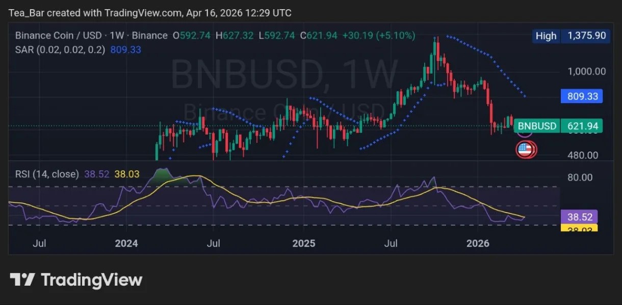 Ảnh chụp nhanh TradingView hàng tuần (16 tháng 4 năm 2026 – 12:29 UTC) cho thấy một thiết lập hỗn hợp nhưng thú vị. Trên cặp $ BNB /USD, giá giao dịch ở mức khoảng $621,94, ghi nhận mức tăng mạnh +5,10% trong tuần và leo lên từ mức thấp gần đây khoảng $592.