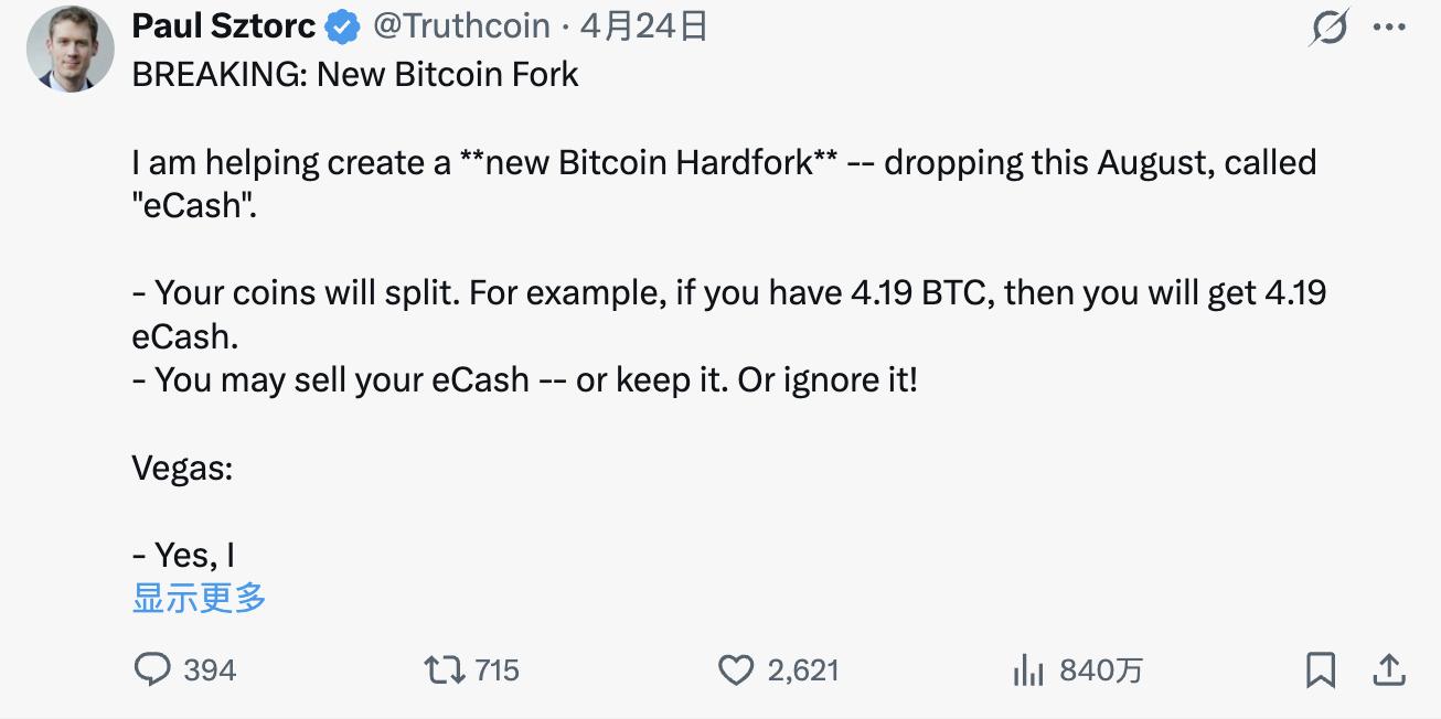 Vào ngày 28 tháng 4, Paul Sztorc tuyên bố rằng ông đang thúc đẩy một dự án phân tách Bitcoin (hard fork) có tên là eCash , dự kiến sẽ chính thức ra mắt vào ngày 21 tháng 8 năm 2026, khi Block Height Bitcoin đạt khoảng 964.000.