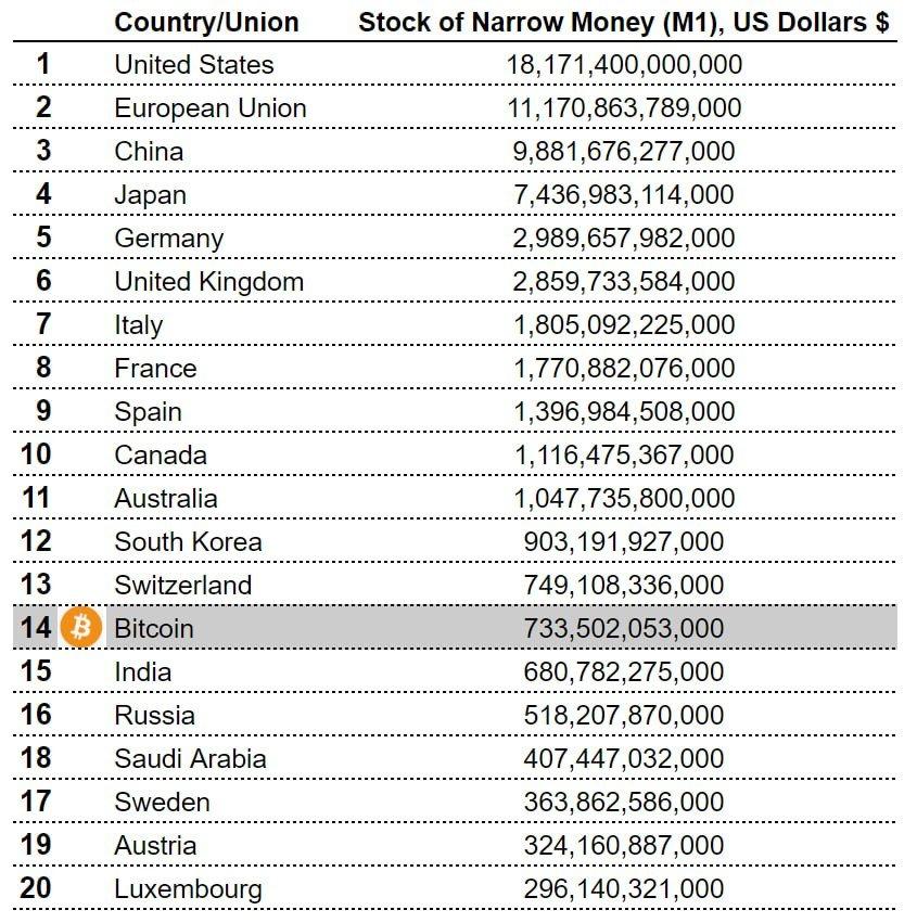 Tin tức ChainCatcher, theo phân tích của công ty thẻ tín dụng Bitcoin Bold, tính đến tháng 12, Bitcoin đã được xếp hạng thành công trong số 15 loại tiền tệ hàng đầu thế giới, trở thành crypto duy nhất trong số 20 loại tiền tệ hàng đầu thế giới. Theo dữ liệu từ CEIC và CoinGecko, tính đến ngày 19/11, giá trị vốn hóa thị trường Bitcoin đã đạt 732,5 tỷ ĐÔ LA.