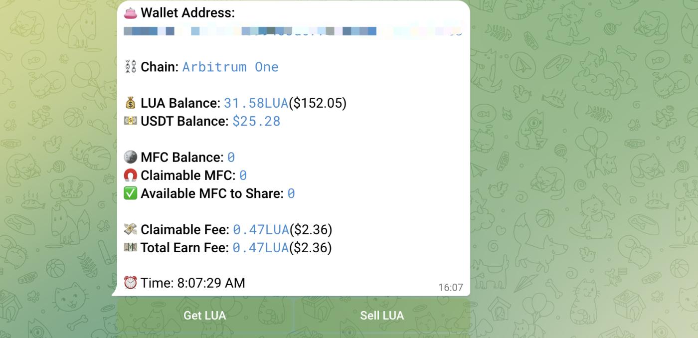 BƯỚC 1. Chọn "Ví" trên trang chính của Sosotribe bot để xem số lượng LUA và USDT