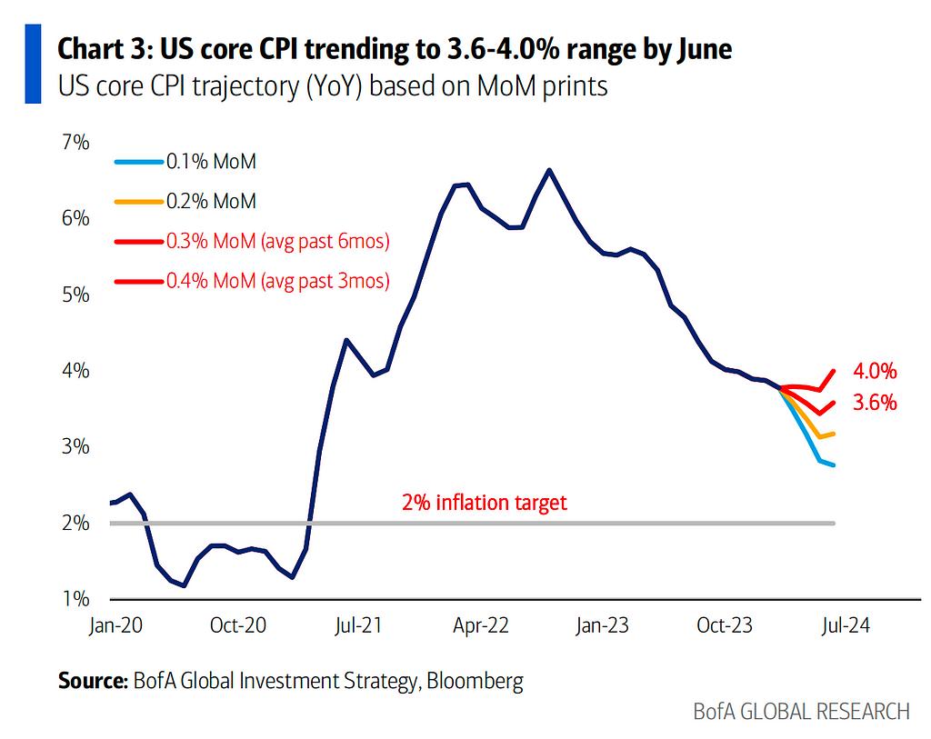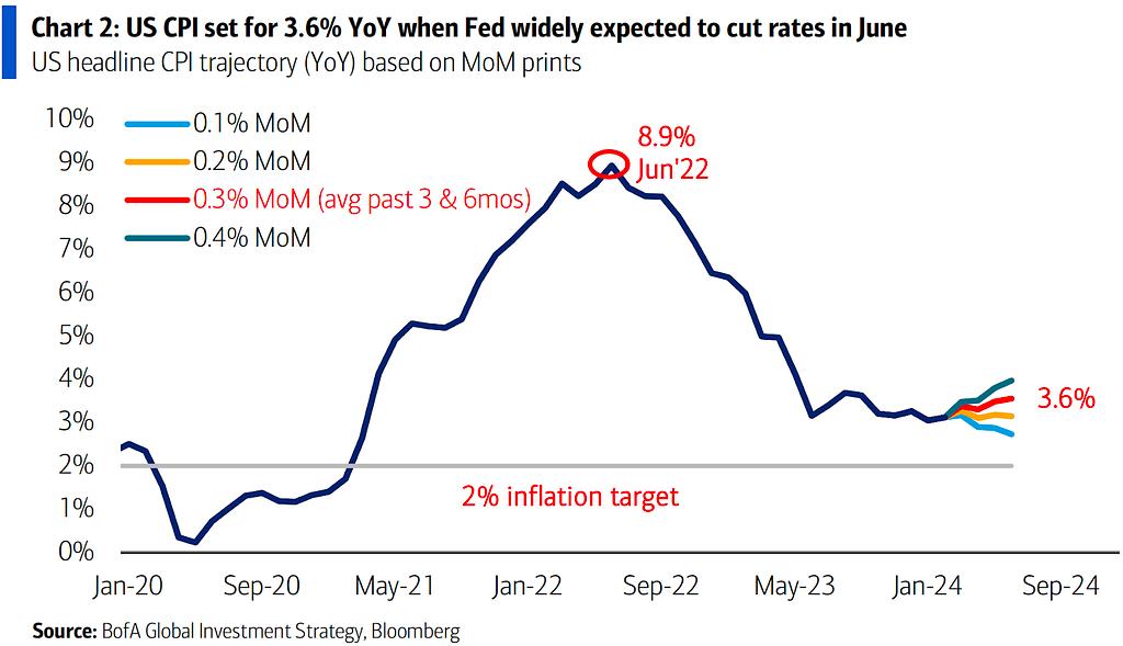 Tỷ lệ lạm phát chung/cốt lõi ở Hoa Kỳ sẽ vẫn ở mức 3,6-4% trong tháng 6 và thị trường kỳ vọng Cục dự trữ liên bang Hoa Kỳ sẽ cắt giảm lãi suất vào thời điểm đó, ngay cả khi tỷ lệ này vẫn còn cách xa mức 2%. Bằng cách này, Cục dự trữ liên bang Hoa Kỳ chấp nhận lạm phát cao hơn và có thể giảm gánh nặng nợ của Hoa Kỳ. Nhưng giảm chính sách đồng nghĩa với việc tiền tệ mất giá, đây là bối cảnh quan trọng để giá crypto và vàng đạt mức cao mới: