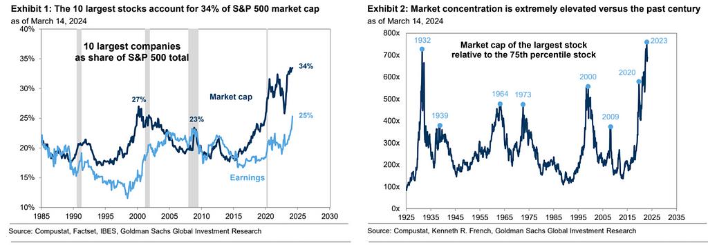 Sự tập trung vào thị trường chứng khoán Hoa Kỳ đã tăng lên đáng kể do thành tích vượt trội của các công ty công nghệ lớn dẫn đầu thị trường, với 10 cổ phiếu hàng đầu hiện chiếm 34% giá trị vốn hóa thị trường của S&P 500 và 25% lợi nhuận, mức cao nhất trong nhiều thập kỷ.