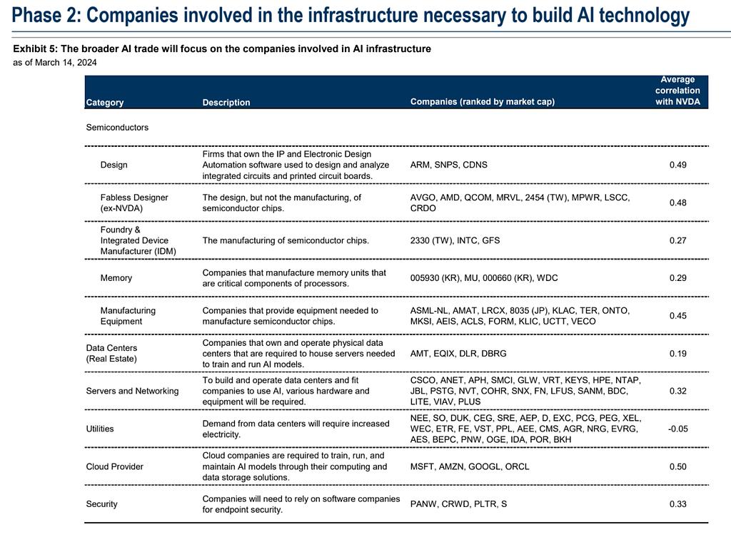 Giai đoạn đầu tiên chủ yếu tập trung vào NVIDIA và giai đoạn thứ hai tập trung vào cơ sở hạ tầng AI bên ngoài NV, bao gồm các công ty bán dẫn, nhà cung cấp dịch vụ đám mây, REIT trung tâm dữ liệu, công ty phần cứng và thiết bị, cổ phiếu bảo mật phần mềm và các công ty tiện ích.