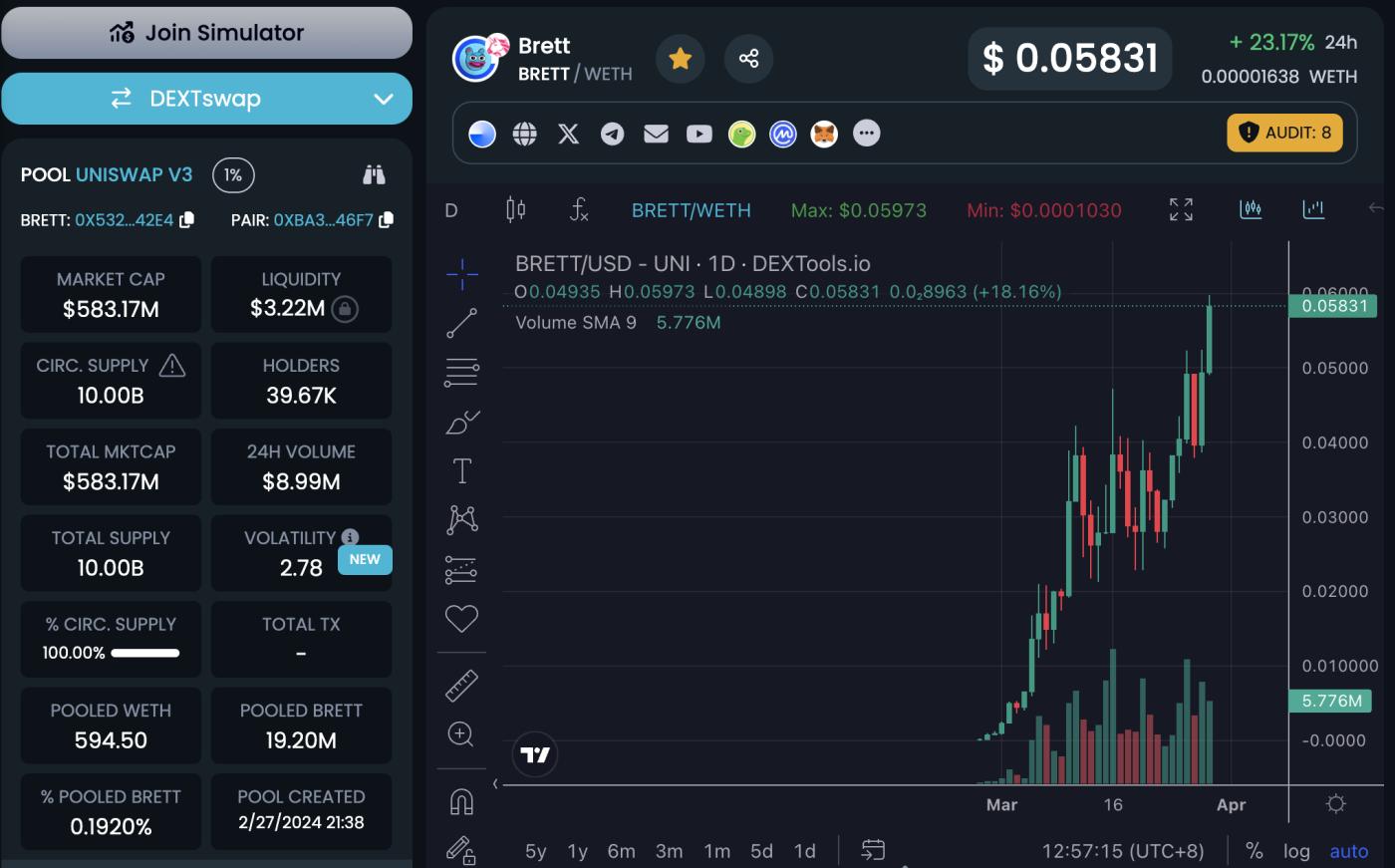Brett là MEME đầu tiên trên chuỗi Base và từng là MEME số một. Thứ đã trở nên phổ biến trong hai ngày qua là DEGEN, thứ đã ngăn chặn đà tăng của Brett. Nhưng điều này không ngăn cản Brett vẫn là đồng MEME đứng đầu chuỗi Base.