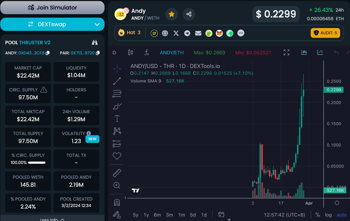 Andy có token cùng tên ở Solana đã từng bùng nổ nhưng đã giảm từ 0,049 đô la xuống còn 0,01 đô la hiện tại, giá trị vốn hóa thị trường khoảng 10 triệu đô la. Mức độ phổ biến của dự án này cũng có thể chấp nhận được.