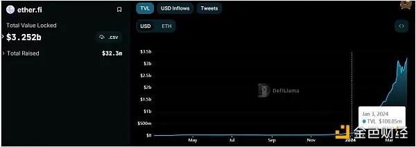 Đánh giá từ hiệu suất dữ liệu trên chuỗi dự án, theo dữ liệu của DefiLama, TVL hiện tại của ether.fi là 3,252 tỷ ĐÔ LA. Như có thể thấy từ hình trên, Ether.fi TVL đã bước vào chế độ tăng trưởng cao kể từ khoảng tháng 1 năm nay. Chỉ trong ba tháng, nó đã tăng từ gần 100 triệu ĐÔ LA lên hơn 3 tỷ ĐÔ LA, tăng gấp đôi lên tới 30 lần.