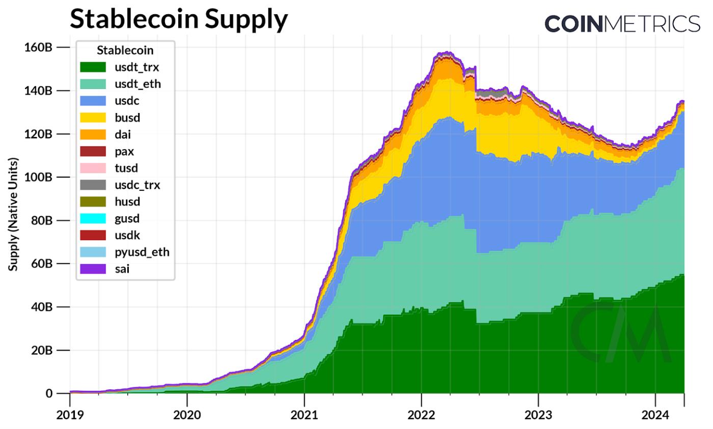 Cùng với tính thanh khoản ngày càng sâu sắc, bối cảnh stablecoin cũng ngày càng đa dạng. Điều này được minh chứng bằng việc giới thiệu các stablecoin như PYUSD của PayPal, vốn đã có một khởi đầu đầy thử thách trong năm với nguồn cung giảm 28% kể từ tháng 1, EURCV được hỗ trợ bằng Euro do Société Générale phát hành và các stablecoin gốc giao thức như GHO của Aave. Gần đây nhất, chúng ta cũng chứng kiến sự ra mắt của “Quỹ thanh khoản kỹ thuật số thể chế BlackRock USD” ( BUIDL (phát triển dự án) ), một quỹ thị trường tiền tệ được mã hóa trên Ethereum. Các dịch vụ này không chỉ bao gồm sự hỗ trợ tài sản thế chấp và rủi ro mà còn ở sự đa dạng của các tổ chức phát hành từ các tổ chức tài chính đến giao thức DeFi . Hơn nữa, khối lượng phát hành và chuyển giao stablecoin cũng đã mở rộng trên các mạng lớp 1 như Solana, ngoài TRON và Ethereum lớp 2, cho thấy cách sử dụng của chúng trên toàn hệ sinh thái.
