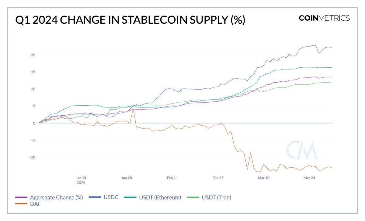 Cùng với sự tăng trưởng về định giá thị trường tài sản kỹ thuật số, stablecoin đã tiếp tục mở rộng trong Quý 1. Nguồn cung stablecoin được chốt bằng đô la Mỹ đã vượt qua 135 tỷ USD, tăng tổng cộng 13,5% trong quý. Tether (USDT) , kẻ tung hứng stablecoin, đã vượt qua mức 100 tỷ USD, với nguồn cung lưu hành trên Ethereum tăng 16%, trong khi nguồn cung trên mạng TRON tăng 11%. USDC của Circle đã có khởi đầu mạnh mẽ trong quý 1, nguồn cung tăng thêm 22% lên 27 tỷ USD — gần với mức được quan sát xung quanh cuộc khủng hoảng ngân hàng khu vực năm ngoái. Trong khi USDT thống trị khối lượng Sàn tập trung (CEX) , các cặp giao dịch USDC đang có sự hiện diện lớn hơn trên các thị trường giao ngay khi thanh khoản được cải thiện. Thị phần ngày càng tăng của hai loại stablecoin hàng đầu cũng có thể một phần là do BUSD do Paxos phát hành ngừng hoạt động, bên cạnh nhu cầu chung về tài sản kỹ thuật số tăng lên.