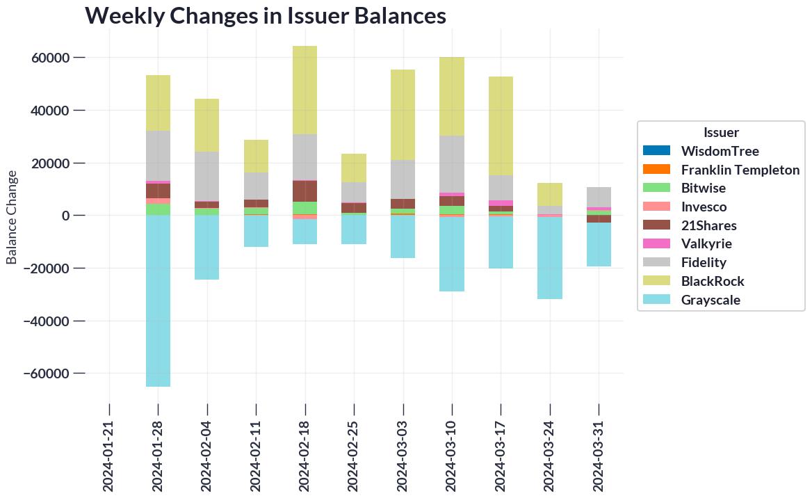 Nhu cầu và sức mạnh của dòng vốn vào các sản phẩm giao dịch trao đổi bitcoin là chưa từng có, khiến nhiều người ngạc nhiên và khiến chúng trở thành quỹ ETF phát triển nhanh nhất trong lịch sử. Sau một quý kể từ khi ra mắt, khoảng 12 tỷ USD đã chảy vào các phương tiện này, nắm giữ ~4% nguồn cung hiện tại của BTC. Trong số 11 tổ chức phát hành, IBIT của BlackRock là người chiến thắng rõ ràng, tích lũy được gần 250 nghìn BTC (~ 17 tỷ USD) kể từ khi thành lập, cùng với một số tổ chức phát hành khác giành được thị phần. Ngược lại, GBTC của Grayscale lại là một ngoại lệ với dòng vốn chảy ra lớn, chủ yếu là do phí cao hơn và hậu quả của vụ phá sản Genesis và FTX.