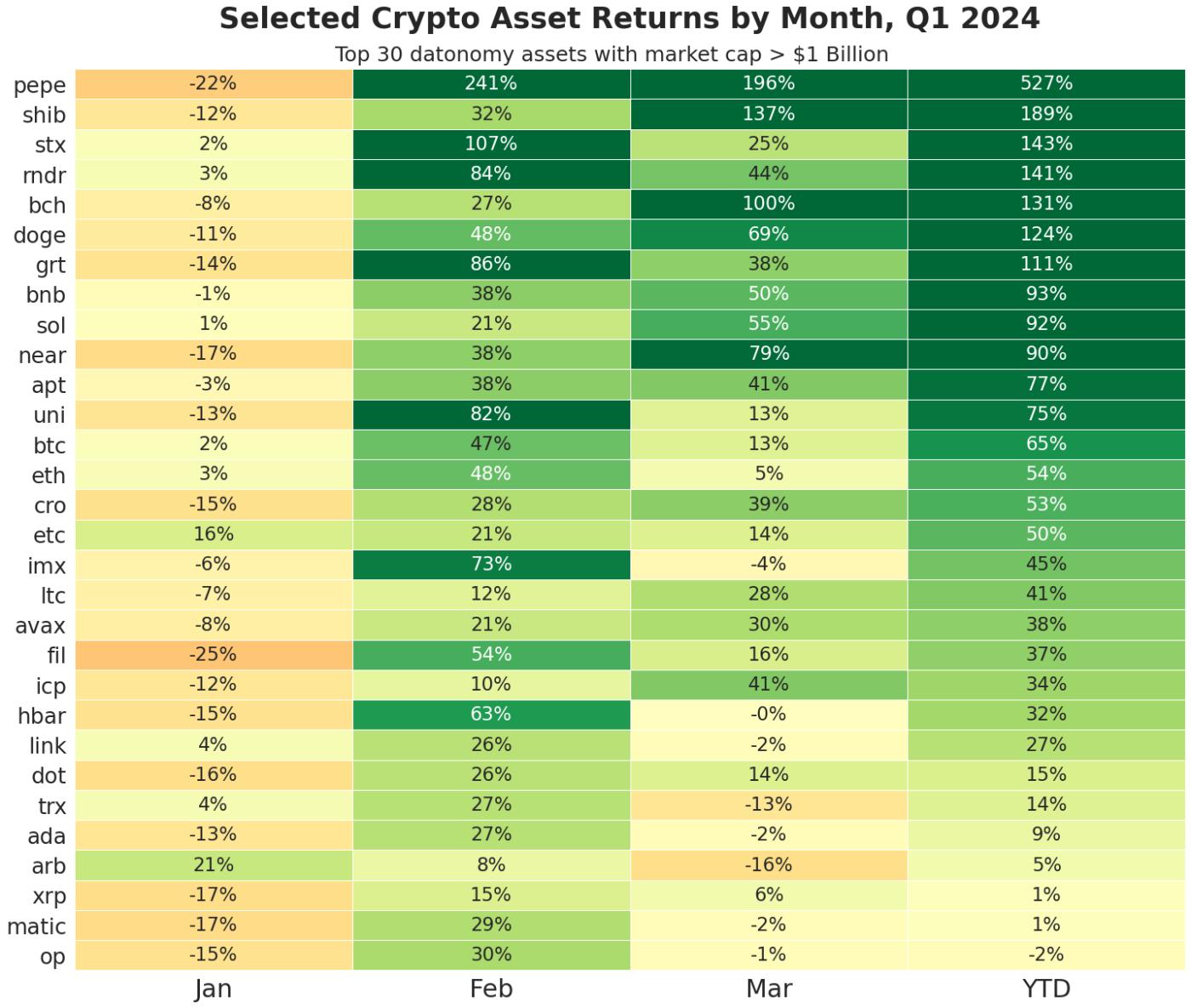 Sức mạnh này được phản ánh trong một số lĩnh vực và tài sản tiền điện tử, từ lớp 1 như Solana (SOL +92%) và Gần (NEAR +90%) đến memecoin như PEPE (PEPE +527%) và các dự án ở giao điểm của AI và tính toán các ứng dụng như Mạng kết xuất (RNDR +141%), cùng một số ứng dụng khác. Hơn nữa, chúng tôi đã thấy nhiều hình thức công cụ, cơ sở hạ tầng và ứng dụng khác nhau sắp thành hiện thực, thúc đẩy cảm giác đổi mới và Optimism trên các hệ sinh thái blockchain. Dưới đây, chúng tôi đề cập đến những phát triển chính định hình bối cảnh tài sản kỹ thuật số trong Quý 1 năm 2024.