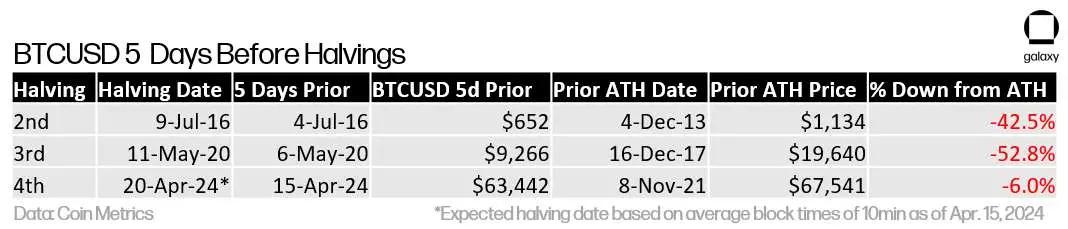 Giá Bitcoin đã vượt mức cao nhất mọi thời đại trước sự giảm nửa lần đầu tiên trong lịch sử . Trong hai giảm nửa Bitcoin lần vào năm 2016 và 2020, giá Bitcoin đã giảm lần lượt 42,5% và 52,8% so với lịch sử trước đó. Mặc dù hành động giá mạnh mẽ của Bitcoin dẫn đến giảm nửa có thể được coi là thị trường đang đi trước giai đoạn cường điệu mà chúng ta thường thấy sau giảm nửa, nhưng động lực thúc đẩy giá Bitcoin trong chu kỳ này là những phát triển mới chưa từng có trong các chu kỳ giảm nửa trước đó. Đặc biệt là sự ra mắt giao spot của Bitcoin ETF tại Hoa Kỳ vào tháng 1 năm 2023.