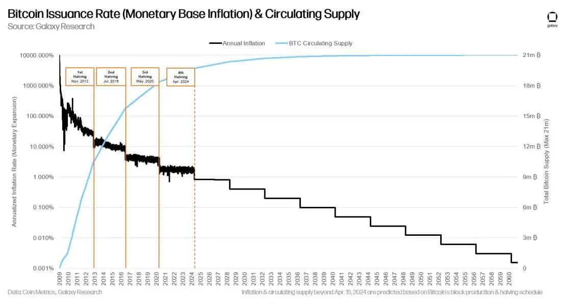 Vào ngày 20 tháng 4 năm 2024, Bitcoin sẽ trải qua giảm nửa lần ở khối số 840.000. Trong lần sự kiện giảm nửa , phần thưởng khối (còn được gọi là “trợ cấp khối”), đại diện cho số lượng Bitcoin mới phát hành được trả cho thợ đào cho mỗi khối được khai thác, sẽ bị cắt giảm một nửa. Phần thưởng khối sau khi giảm nửa lần Bitcoin sẽ giảm từ 6,25 BTC xuống 3,125 BTC (tương đương với mức giảm hàng ngày từ khoảng 900 BTC xuống còn khoảng 450 BTC). Do đó, tỷ lệ phát hành hàng năm của Bitcoin sẽ giảm từ khoảng 1,7% xuống còn khoảng 0,85%. Dữ liệu Coin Metrics, đến giảm nửa lần , 93,7% tổng lượng cung ứng Bitcoin sẽ được lưu hành.