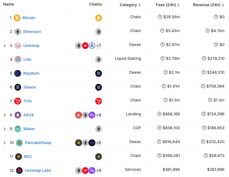 Dưới đây là 12 thực thể hàng đầu tính phí trong 24 giờ (từ @ DefiLlama) :