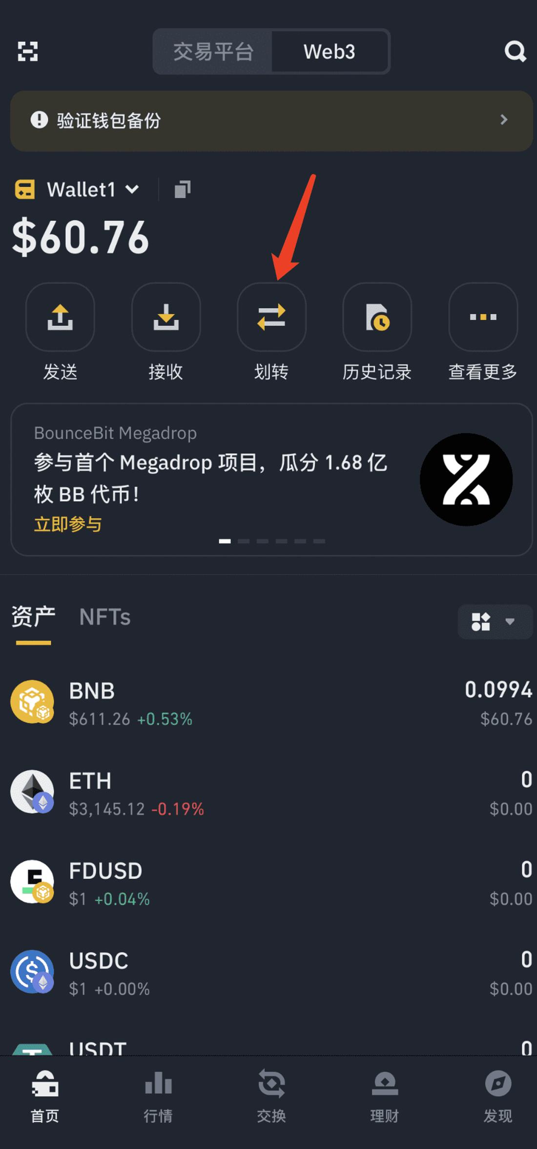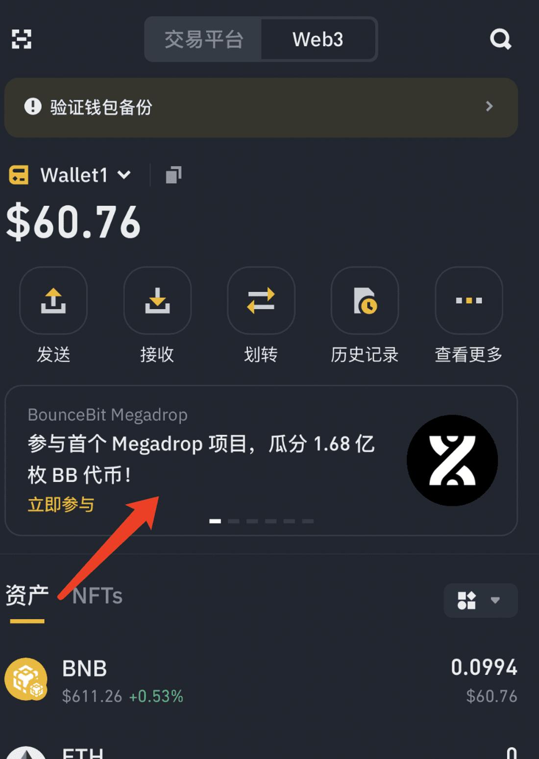 Bây giờ hãy thử nhấp vào nút Web3, vì bạn chưa có tiền trong ví, hãy chọn chức năng chuyển và chuyển ** BNB ** nhấn trước đó từ Ứng dụng Binance . Hãy nhớ bật xác nhận nhận dạng khuôn mặt, nếu không sẽ rất rắc rối khi xác nhận từng bước.