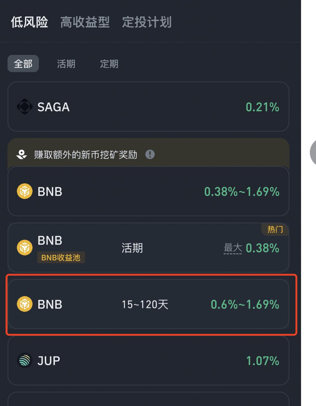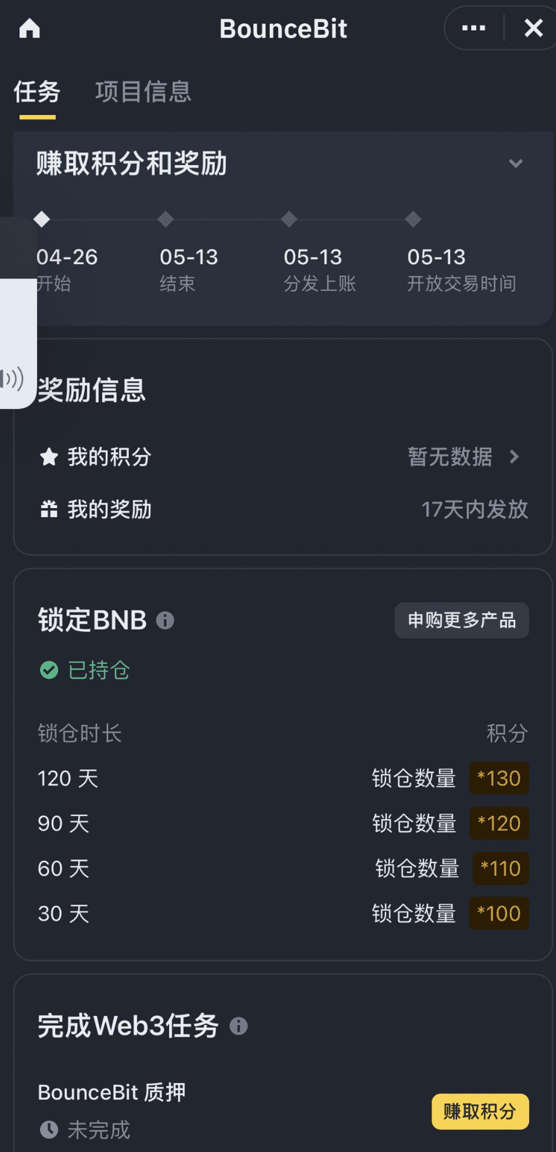 Trong giao diện mở ra tiếp theo, chỉ cần chọn khoảng thời gian ** BNB ** bạn muốn khóa theo sở thích cá nhân của mình. Thời gian càng lâu, bạn khóa càng nhiều BNB thì số điểm bạn nhận được càng lớn. 120 ngày. Bằng cách này, bạn có thể nhận được lãi suất hàng năm là 1,69%, đồng thời, bạn có thể nhận được hệ số nhân cao nhất khi khai thác điểm Bouncebit.