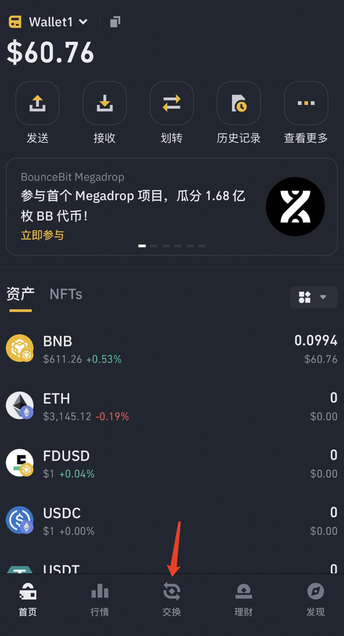 Tôi đã chuẩn bị ** BNB trị giá 60 USD ở đây , hiện có trong ví Web3 của tôi. Tiếp theo bạn cần trao đổi một số BTC **. Vì nằm trên mạng BSC nên BTC có tên là BTCB. Tìm chức năng trao đổi ở giữa phía dưới như hình bên dưới.