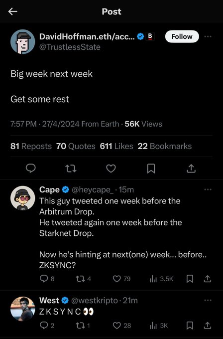 Cuối cùng đã đến lúc dành cho $ZKS chưa? 👀 WDYT về @zksync Airdrop. @TrustlessState được gọi là $ARB Airdrop trước một tuần.. Anh ấy còn gọi $STRK Airdrop trước một tuần.. Bây giờ có phải là lúc dành cho $ZKS không? #zksync #zks #AirdropAlert