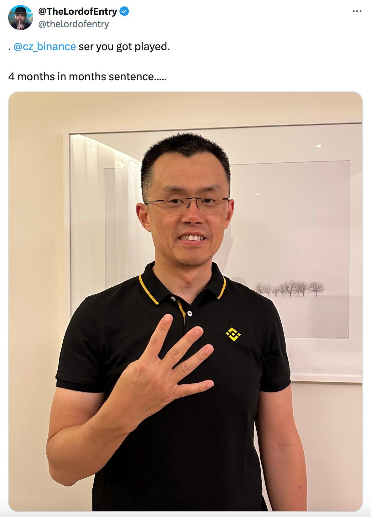 Sáng nay CZ đã bị thẩm phán liên bang kết án 4 tháng tù mặc dù các công tố viên yêu cầu mức án 36 tháng. Ồ! Anh chàng này thật hiểu biết. Anh ta chỉ phải ngồi tù 4 tháng và có hàng tỷ đô la trong ngân hàng (và tiền điện tử). Tôi khó có thể tin rằng anh ấy không hề biết rằng mình đã vi phạm luật chống rửa tiền. Nhưng rõ ràng, anh ấy đã xin lỗi *chân thành* và thẩm phán đã tát nhẹ vào cổ tay anh ấy. Đây là sự tương phản lớn so với mức án 25 năm tù của SBF . Chắc chắn, CZ không làm mất tiền của khách hàng nhưng số lượng hoạt động bất hợp pháp mà Binance thực hiện có lẽ cũng tương đương nếu không muốn nói là có hại hơn. Tất cả những gì tôi có thể nói là CZ thực sự là một tuyển thủ chuyên nghiệp. Tôi hy vọng anh ấy sẽ hướng năng lượng của mình vào điều gì đó có lợi hơn cho loài người khi anh ấy ra khỏi tù.