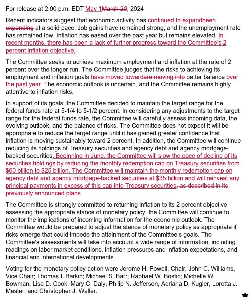 Hôm nay là ngày công bố của FOMC . Đúng như dự đoán, Fed giữ nguyên lãi suất ở mức 5,25% - 5,5%. Tuyên bố FOMC ngày hôm nay có khá Bit thay đổi so với tuyên bố tháng 3 như đã nêu ở trên. Đầu tiên, Fed thừa nhận rằng tiến trình hướng tới lạm phát 2% đang bị đình trệ. Thứ hai, quá trình giảm dần QT sẽ chính thức bắt đầu vào tháng 6. Thay vì loại bỏ tới 60 tỷ USD nguồn cung tiền mỗi tháng thông qua việc rút lại Treasury , Fed sẽ hạ mức trần 60 tỷ USD xuống còn 25 tỷ USD. Fed sẽ giữ mức trần 35 tỷ USD cho đại lý MBS nhưng nếu số tiền mua lại MBS hàng tháng vượt quá 35 tỷ USD, họ sẽ sử dụng số tiền dư thừa để mua kho bạc thay vì mua MBS. Tôi tự hỏi liệu Fed có làm điều này để đảm bảo đủ nhu cầu về trái phiếu kho bạc hay không khi hoạt động vay mượn của chính phủ liên bang đang tăng tốc.