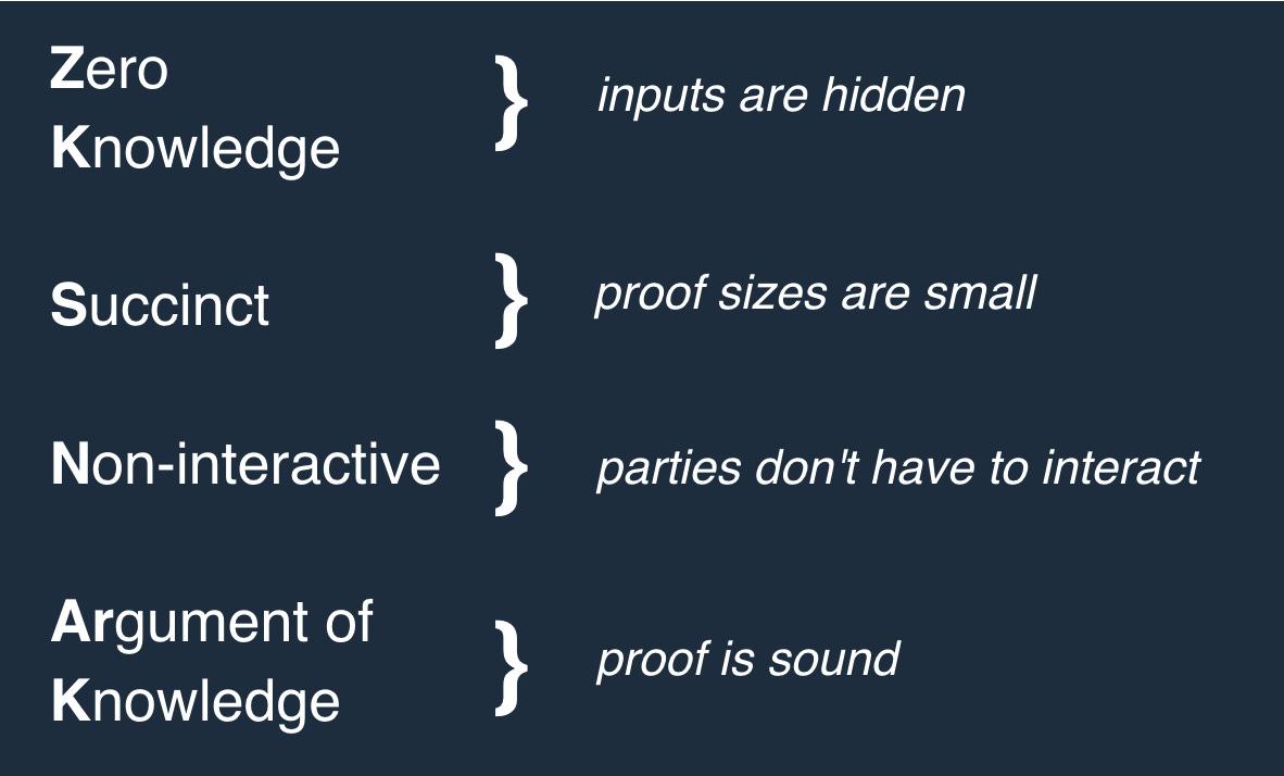 - “Zero-Knowledge”(Kiến thức bằng 0): Điều này có nghĩa là những thông tin đầu vào sẽ bị ẩn đi và không được tiết lộ cho người xác minh. Nói cách khác, người xác minh không thể biết bất kì điều gì về kiến thức đó mà chỉ biết tính hợp lệ của kiến thức đó.