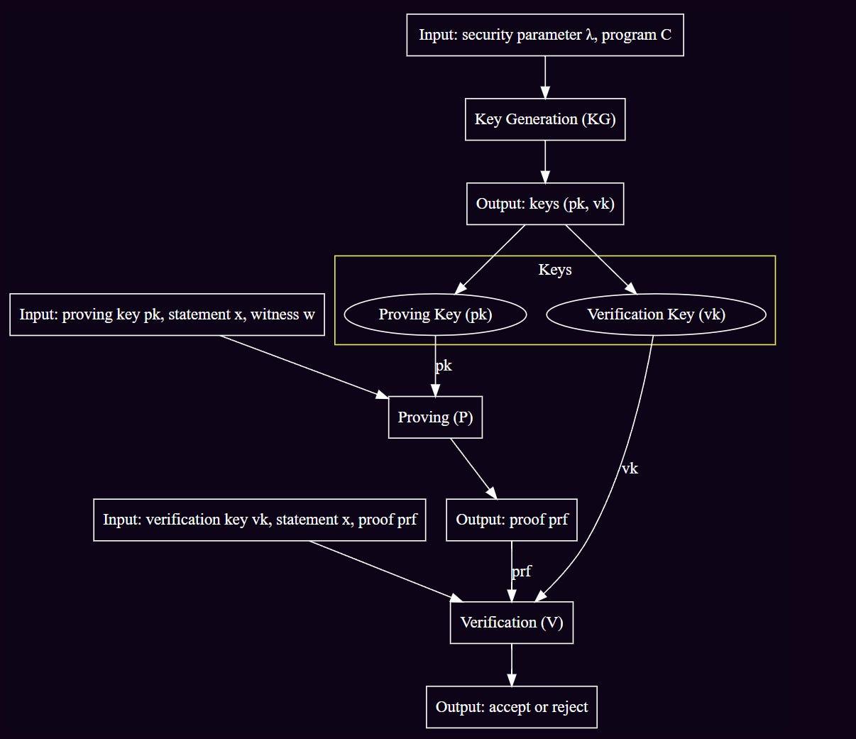 - Key Generation(KG): Đây là thuật toán tạo khóa, sẽ tạo ra một cặp khóa, một để chứng minh (pk) và một để xác minh (vk). Thuật toán tạo khóa lấy đầu vào là tham số bảo mật λ và chương trình C, sau đó xuất ra các khóa. Bước này còn gọi là bước Trusted Setup. Ta sẽ đi vào chi tiết của nó trong phần bên dưới.(pk, vk) = KG(λ, C)