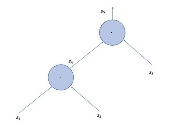 Nhìn vào hình trên, ta thấy quá trình này bắt đầu từ cổng nhân đầu tiên nhận s1 và s2 làm đầu vào và tạo ra s4 là đầu ra. Tiếp theo, s4 và s3 được đưa vào cổng nhân thứ hai để tạo ra đầu ra cuối cùng s5.