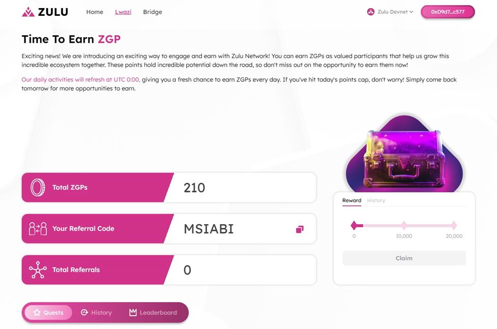 Hướng dẫn đầy đủ: https:// Trung bình.com/@zulu_network/earn-zulu-genesis-points-zgp-now-phase-1-lwazi-c69323fd3ea1