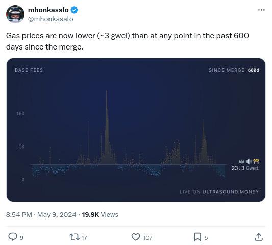 - Phí gas ETH Mainnet ở mức thấp lịch sử, h/t @mhonkasalo: