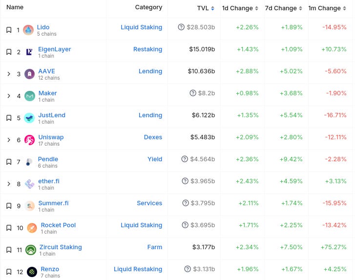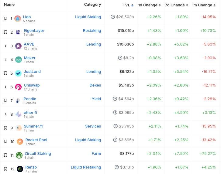 Đây là 12 giao thức hàng đầu của Tổng giá trị khóa (TVL) (từ @ DefiLlama) :