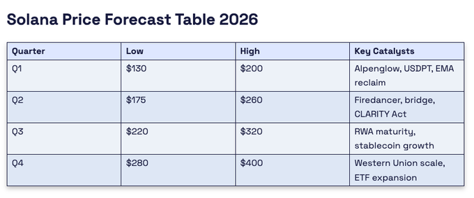 📈 Solana có đạt mức 400 đô la vào quý 4 năm 2026? Lộ trình năm 2026 của Solana cho thấy tiềm năng tăng trưởng ổn định, với Firedancer, việc mở rộng RWA và sự phát triển của stablecoin có thể thúc đẩy giá SOL. Mục tiêu doanh thu dao động từ 130–200 đô la vào đầu năm 2026 đến 280–400 đô la vào cuối năm.