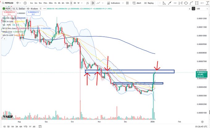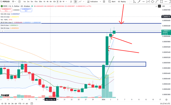 $PEPE Bật lên hàng ngày thành điểm xoay trên cao Lưu ý sự phát triển của thân nến ban đầu từ thân nến lớn thành nến xoay twitter.com/BigCheds/status/20...