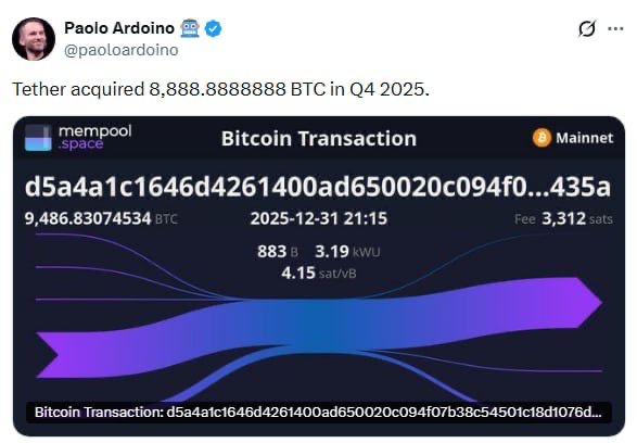 Theo CEO Paolo Ardoino, Tether đã mua 8.888,8888888 $BTC trong quý 4 năm 2025.